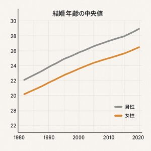近年の傾向をふまえると、2025年の結婚年齢の中央値は男女ともにやや上昇する可能性が高いと考えられます。過去数十年にわたり、初婚年齢は徐々に高くなってきており、この流れは2025年においても大きく変わらないと予想されます。